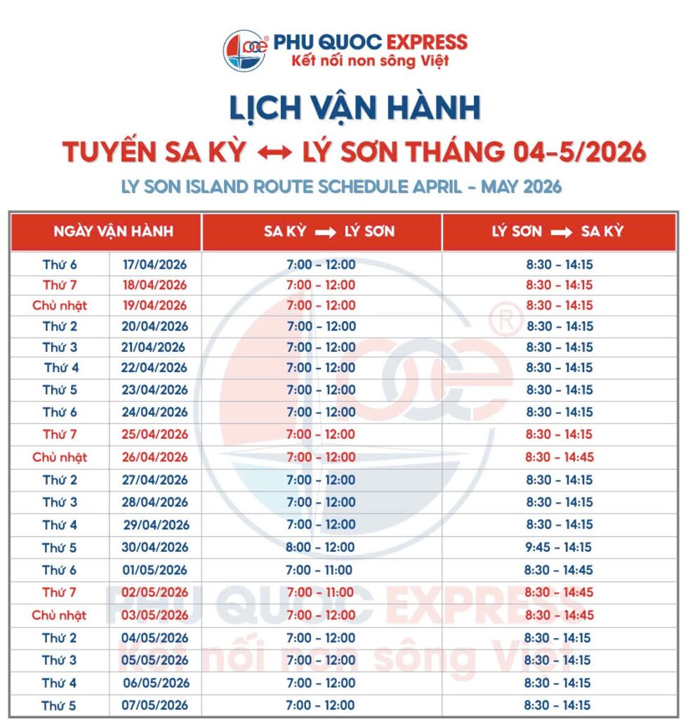 Lưu ý: Lịch trình trình trên có thể thay đổi liên tục, tùy thuôc vào điều kiện thời tiết và kế hoạch khai thác của BQL cảng Lý Sơn. Quý khách vui lòng gọi hotline: 0976575442 để biết thêm chi tiết nhất. Xin cảm ơn!